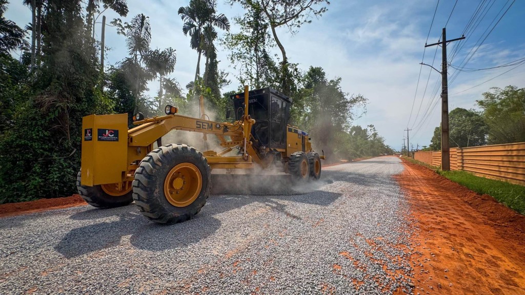 As equipes já concluíram serviços de drenagem, aterro, sub-base e base em 1,1 km dos 1,8 km previstos. Neste trecho, a aplicação da brita já está em andamento para fechamento da base, etapa que antecede a imprimação asfáltica. O restante do percurso será executado após a realocação dos postes de energia que interferem na obra.