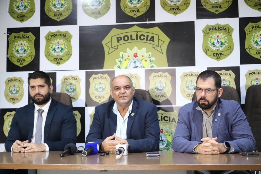 Durante coletiva de imprensa, o delegado-geral da PCAC falou sobre a operação. Foto: Alice Leão/SecomA investigação foi solicitada à Polícia Civil pela Secretaria de Estado de Saúde (Sesacre). Desde o início de 2023, a gestão da Sesacre levantava suspeitas que, com o avanço do tempo e a realização de investigações minuciosas, resultaram na confirmação das irregularidades.