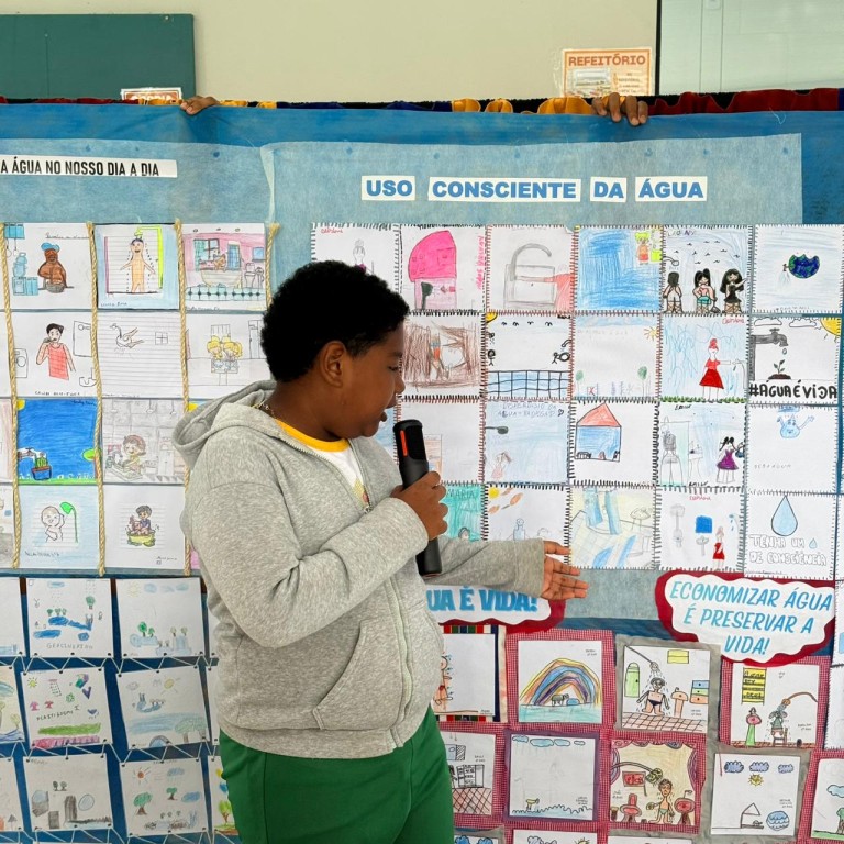 A culminância do projeto foi marcada pela apresentação da Colcha de Retalhos da Água, um mural coletivo construído a partir de produções individuais dos estudantes em sala de aula. Cada “retalho” representa reflexões sobre temas como o ciclo da água, sua importância para a vida, o combate à poluição e a desigualdade no acesso ao recurso.