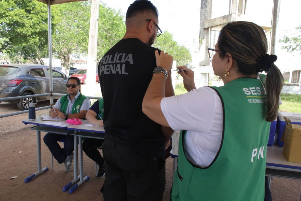 Campanha de vacinação contra sarampo para servidores no Complexo Penitenciário de Rio Branco. Foto: Zayra Amorim/IapenAdriana Maia, chefe da Divisão de Assistência ao Servidor Penitenciário (DASP), disse que campanhas como esta são disponibilizadas todos os anos aos servidores do Iapen: “Todo ano nós fazemos essa campanha de vacinação para os servidores, como prevenção às doenças. É a segunda vez que fazemos a ação, a primeira foi com servidores da sede do Iapen”.