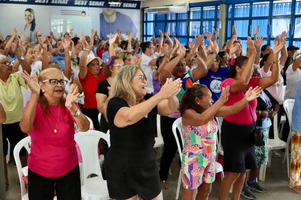 Elenilde de Andrade conta que aproximadamente 200 idosos participam das ações, e neste evento foram convidados 150 participantes. Foto:Alice Leão/SecomRealizada no Serviço Social do Transporte e Serviço Nacional de Aprendizagem do Transporte (Sest/Senat), a programação contou com momentos de descontração e integração, como alongamento, show de talentos, aula de hidroginástica, forró e com ação de saúde, sendo feita aferição de pressão, glicemia e testes rápidos.