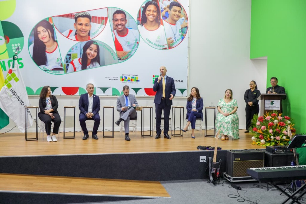 A mesa de abertura contou com a presença do reitor do Ifac, Fábio Storch; do presidente da Fundação de Cultura Elias Mansour (FEM), Minoru Kinpara; e das pró-reitoras do Instituto: Hérica Satrapa (Pesquisa, Inovação e Pós-Graduação), Ana Cláudia Garcia (Ensino) e Luana de Melo (Extensão).