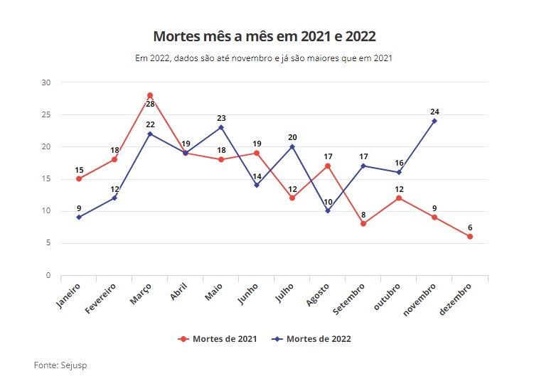 Até novembro de 2022, foram 196 mortes violentas no estado. Número já pe maior do que o registrado em 2021, quando foram 181 vítimas da violência.