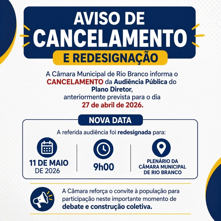 A Câmara Municipal de Rio Branco informa o cancelamento da audiência pública referente ao Plano Diretor, que estava anteriormente prevista para o dia 27 de abril de 2026.