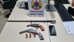 Os policiais militares da Rotam encaminharam os envolvidos, juntamente com os armamentos, e o Bptran conduziu o veículo à delegacia, para que fossem tomadas as providências cabíveis.
