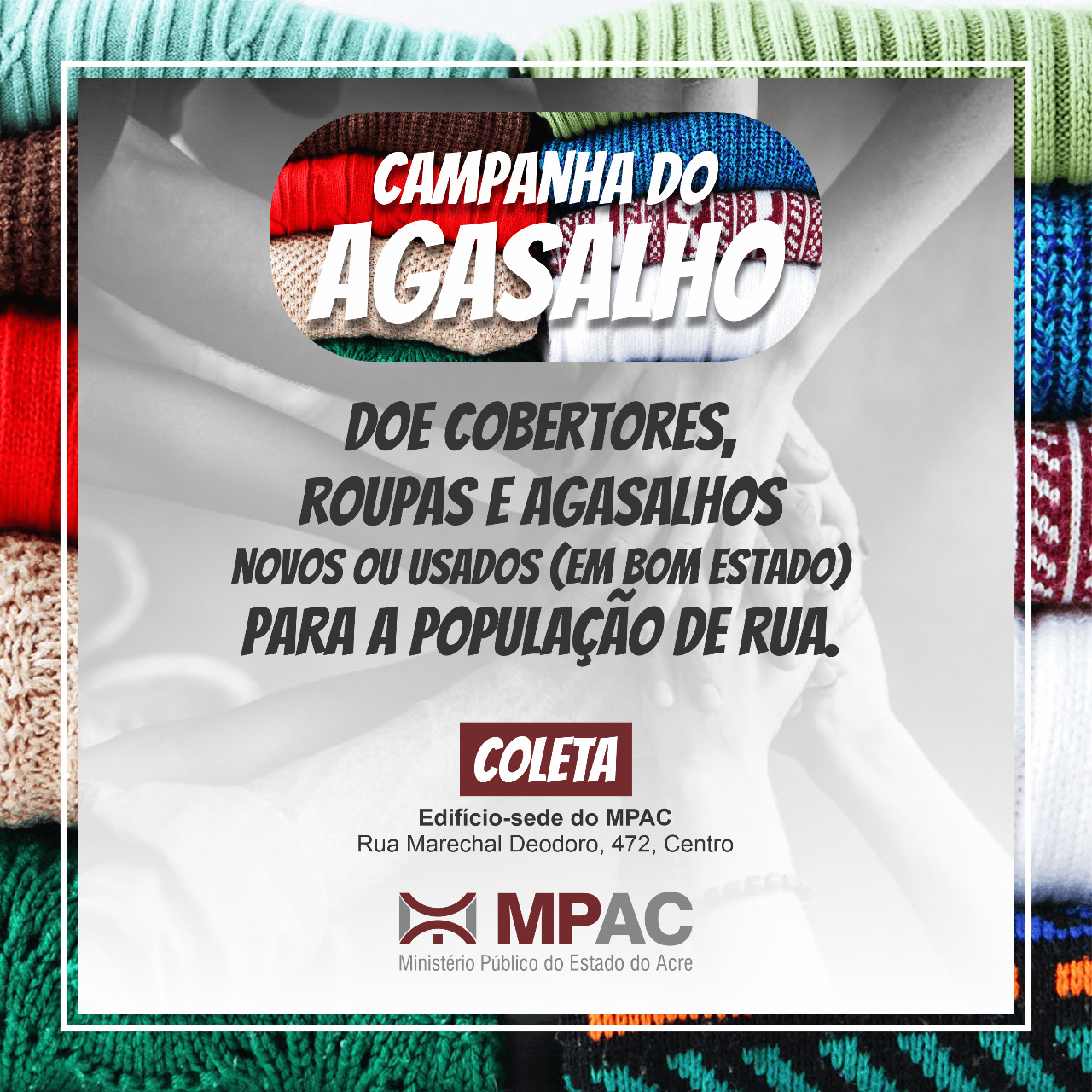 Com a queda da temperatura no Acre, o MPAC também está realizando mais uma edição da “Campanha do Agasalho”, para arrecadar roupas, cobertores e agasalhos que serão destinados à população em situação de rua. A ideia é mobilizar membros e servidores da instituição e a sociedade em geral em favor das pessoas mais vulneráveis neste momento. Para contribuir basta levar a doação até o prédio sede do MPAC, localizado na Rua Marechal Deodoro, nº. 472, Centro, no período das 8h às 18h, na recepção ou guarita do prédio.