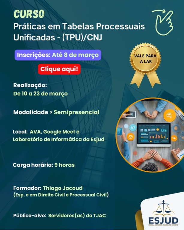 A Escola do Poder Judiciário do Acre (Esjud) abriu as inscrições do curso “Práticas em Tabelas Processuais Unificadas – (TPU)/CNJ”. O prazo para garantir vaga na ação educacional segue até o dia 8 de março.