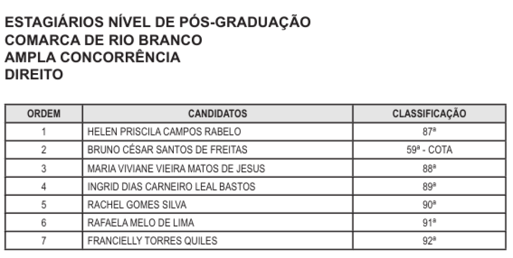 Na quinta-feira, 5, também foram publicadas duas convocações. A primeira, nível de pós-graduação para Sistema de Informação e Serviço Social para Rio Branco. A segunda destinado a graduação em Direito para Cruzeiro do Sul e Porto Acre: