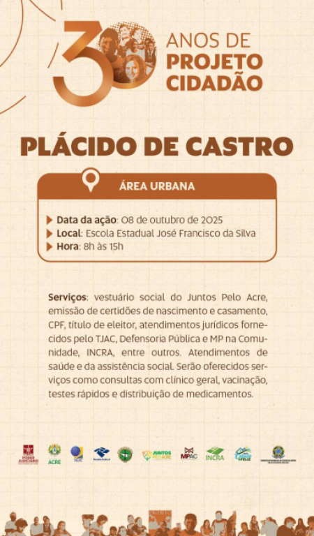 O Projeto Cidadão será realizado nesta quarta-feira, 8, em Plácido de Castro. Mais uma vez, o Tribunal de Justiça do Acre (TJAC), em parceria com instituições locais, levará serviços essenciais para a população. Os atendimentos ocorrem a partir das 8h, na Escola Estadual José Francisco da Silva.