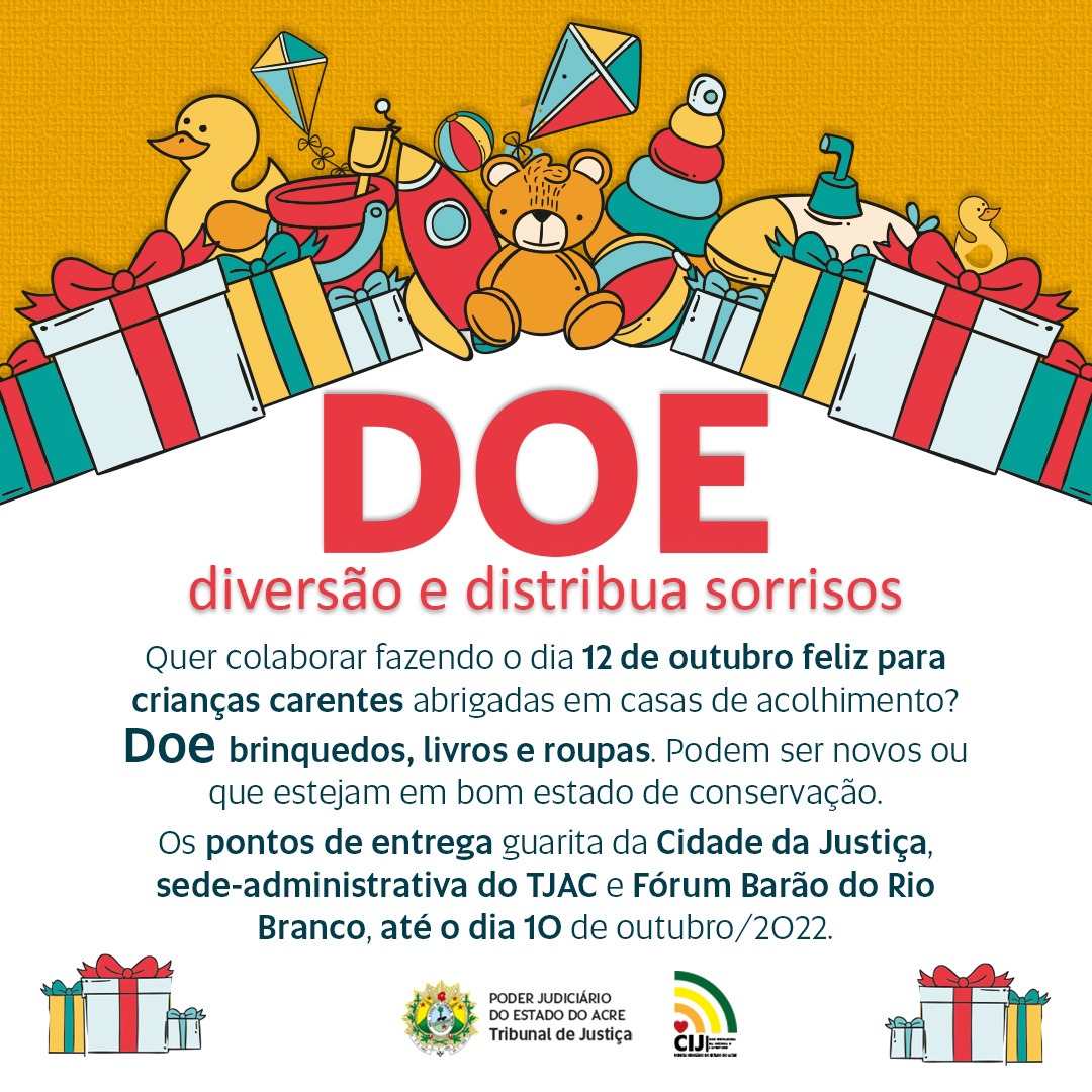 Quer contribuir com alegria de crianças e adolescentes neste dia 12 de outubro? Participe da campanha de arrecadação de brinquedos, livros e/ou roupas do Tribunal de Justiça do Acre, por meio da Coordenadoria da Infância e Juventude (CIJ).