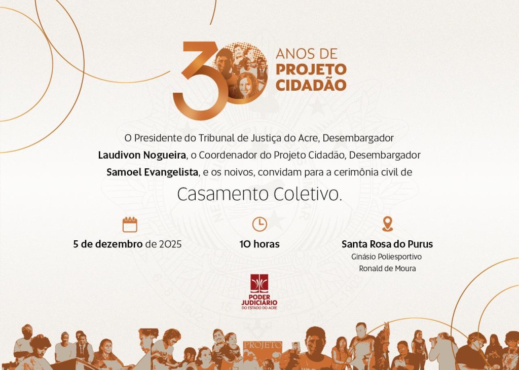 A última edição do Projeto Cidadão deste ano de 2025 será realizada em Santa Rosa do Purus. Encerrando o cronograma comemorativo de 30 Anos do maior projeto social do Tribunal de Justiça do Acre (TJAC), os atendimentos serão realizados nesta quinta e sexta-feira, 4 e 5, na Escola Estadual Padre Paolino Maria Baldassari, situada na Rua Djalma Batista do Nascimento, s/n, bairro Cidade Nova.